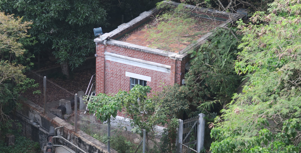 第1站:下水塘 建築現英倫風 由香港仔天后廟起步,上過長長斜路後,便來到水塘入口,此時依路牌指示往右走,走過一、二號海水配水庫,便很快到達下水塘。